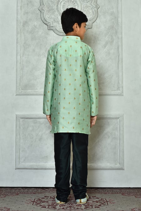 Light green kurta featuring a paisley pattern, mandarin collar, and full sleeves. Paired with a churidar in a complementary color.