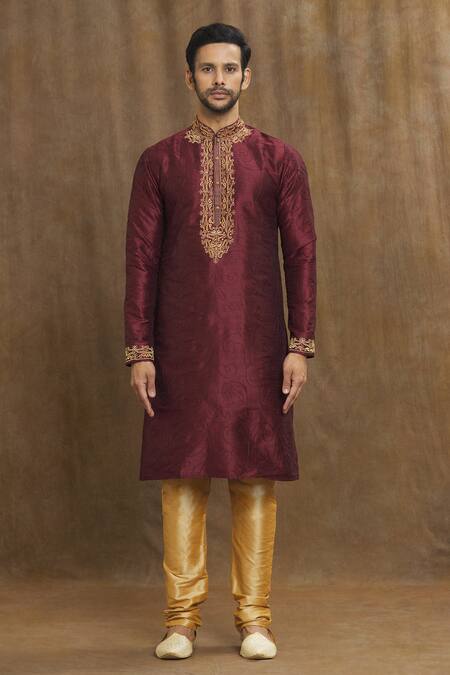 Wine kurta featuring all over threadwork paisley pattern and mandarin collar. Paired with a churidar featuring drawstring closure.