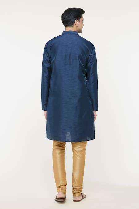 Navy blue kurta featuring a stand collar and full sleeves with a floral and paisley woven pattern