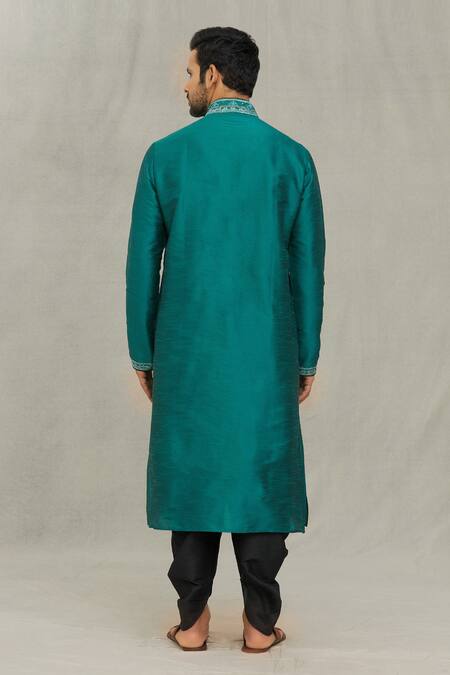 Rama green embroidered kurta in art silk featuring a mandarin collar and long sleeves. Paired with a black dupion silk dhoti pant.
