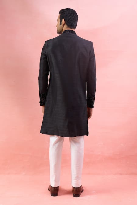 A black silk blend sherwani featuring a band collar, full sleeves, and a designer patta pattern on the hem and cuffs. It is paired with a white poly viscose pant.