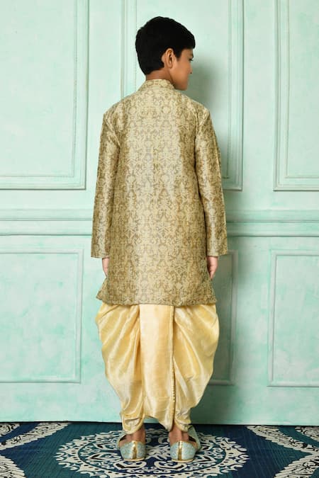 Brown kurta in jamawar fabric featuring a mandarin neckline and full sleeves. Paired with a beige dupion art silk dhoti.