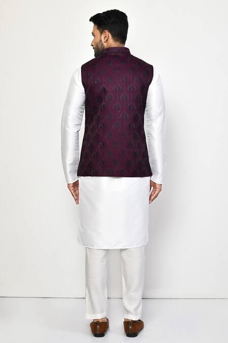 Purple bundi featuring all over peacock feather embroidery. Paired with a white kurta and pant.