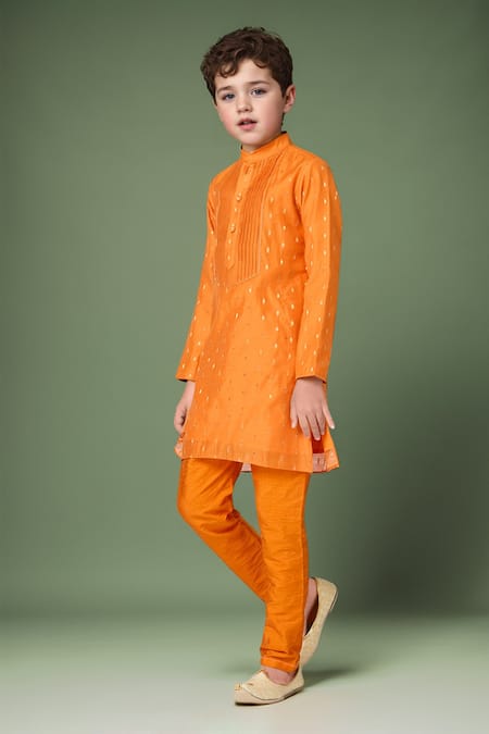 Orange kurta featuring pintuck detailing and zari butta accents. Paired with a solid churidar with an elasticated waistband.