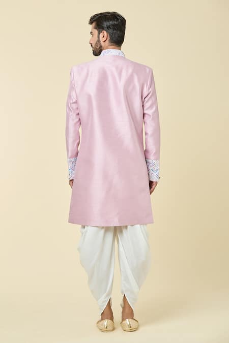 Pink straight kurta featuring leaf embroidery on the collar, cuffs, and hem. Paired with a peshwari dhoti pant in art silk.