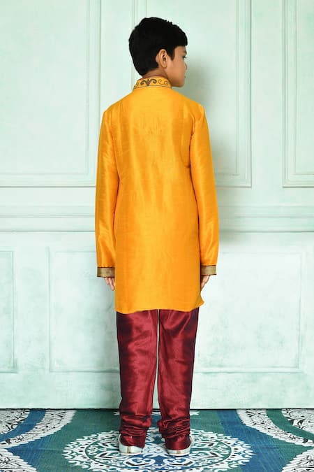 Yellow kurta in dupion art silk featuring floral embroidery and a mandarin collar. Paired with a red churidar for a complete look.