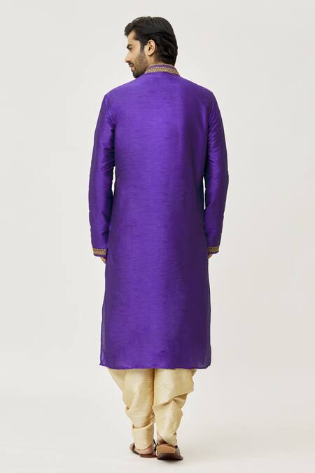 Purple art silk kurta featuring aari embroidered placket and mandarin collar. Paired with dark beige dupion silk dhoti pant for a coordinated look.