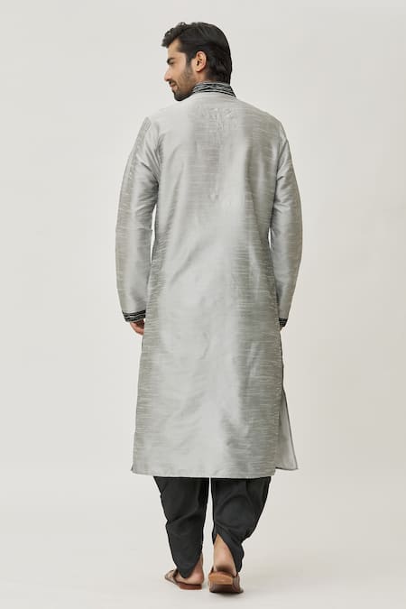 Light grey kurta featuring abstract embroidery on the placket and cuffs. Paired with black dupion silk dhoti pant for a complete look.