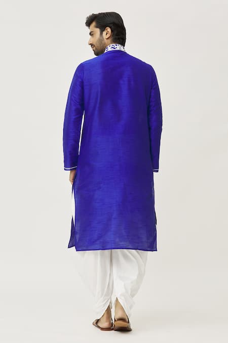 Royal blue kurta featuring dori embroidered placket and cuffs. Paired with off-white dupion silk dhoti pant.