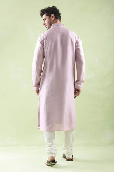 Purple kurta featuring embroidered placket and band collar. Paired with a matching churidar made from cotton blend.