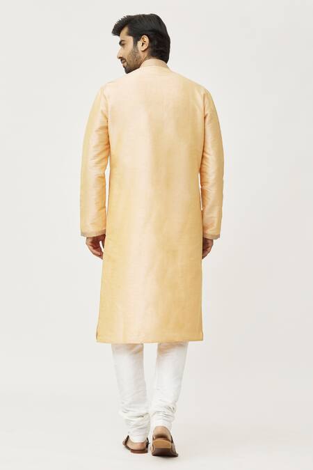 Light pink kurta featuring floral embroidery on the placket and cuffs. Paired with an off-white churidar made of dupion silk.