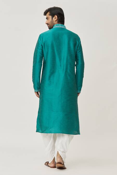 Rama green art silk kurta featuring thread embroidered placket and cuffs. Paired with off-white dupion silk dhoti pant.