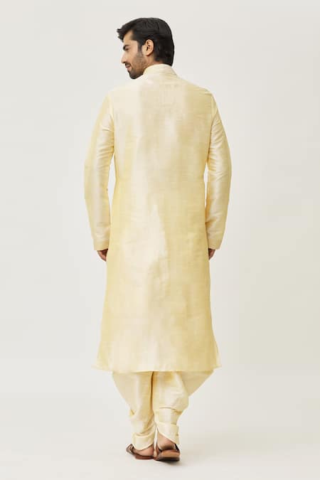 Beige art silk kurta featuring a thread embroidered placket and cuffs. Paired with dupion silk dhoti pant for a coordinated look.