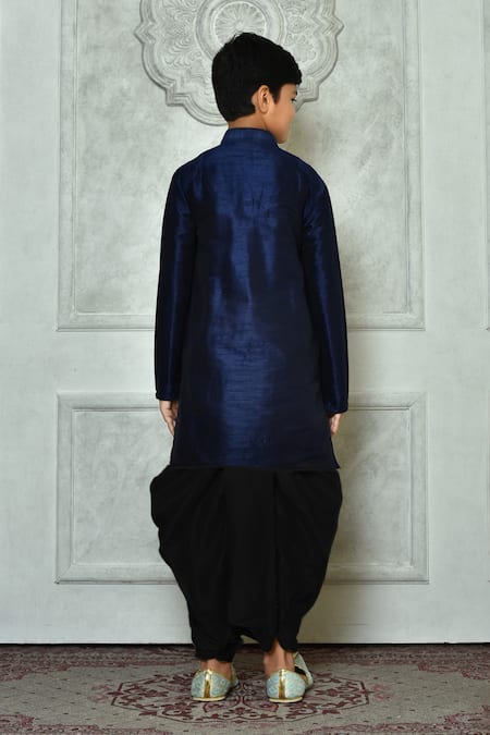 Navy blue kurta featuring full sleeves and a mandarin neckline with front buttons. Paired with a black dhoti pant made from dupion art silk.