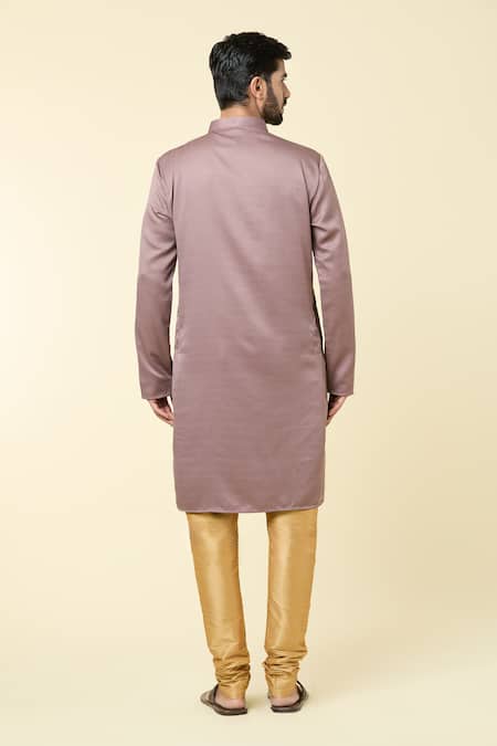 Brown kurta featuring a band collar, buttoned placket, and long sleeves. Paired with a gold churidar made from art silk.