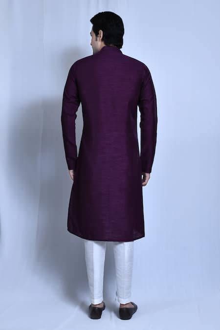 Plum purple kurta featuring full sleeves, band collar neckline, and front button closure. Paired with straight white pant crafted in lightweight fabric.
