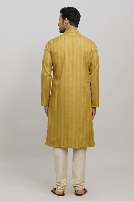 Mustard yellow kurta featuring a geometric print, band collar, and embroidered details. Paired with an elasticated churidar with side seam pockets.