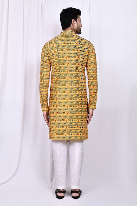Yellow kurta featuring Om Mahakal print and a band collar. Paired with white pants made of Banglori silk.