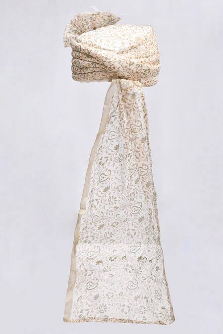 Off-white safa featuring all-over print with gold border and contrast tone floral-paisley motifs