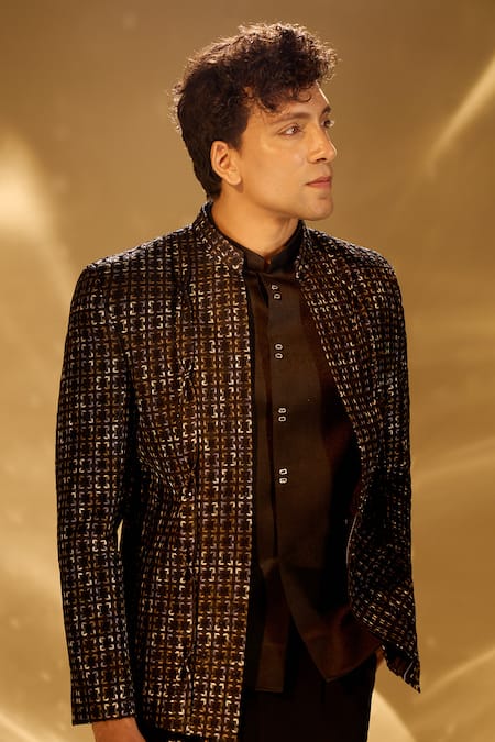 A black bandhgala made from art silk with faux satin lining, featuring resham hand embroidery. It is paired with a black shirt.