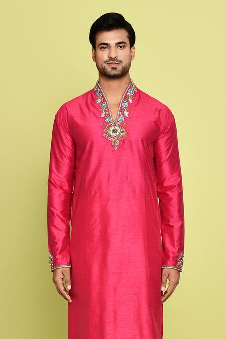Fuchsia pink straight kurta featuring multi-color stone and resham hand embroidery around the neckline and sleeves. Paired with solid white pant with a semi-elastic waistline.