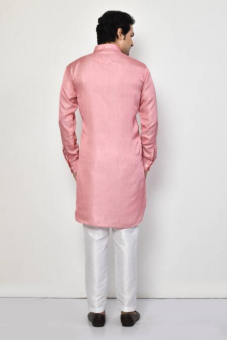 Pink satin kurta featuring a spread collar and full sleeves. Paired with white cotton blend pants with a semi-elasticated waistband and side pockets.