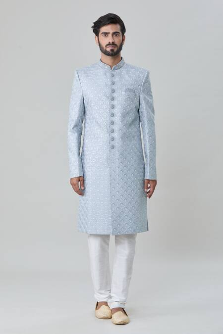 Blue sherwani featuring scallop tonal embroidery with sequin highlights. Paired with a churidar for a complete look.