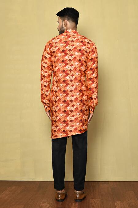Orange kurta featuring a scallop print, mandarin collar, and full sleeves. Paired with a black pyjama, this set is crafted from cotton and Italian fabric.