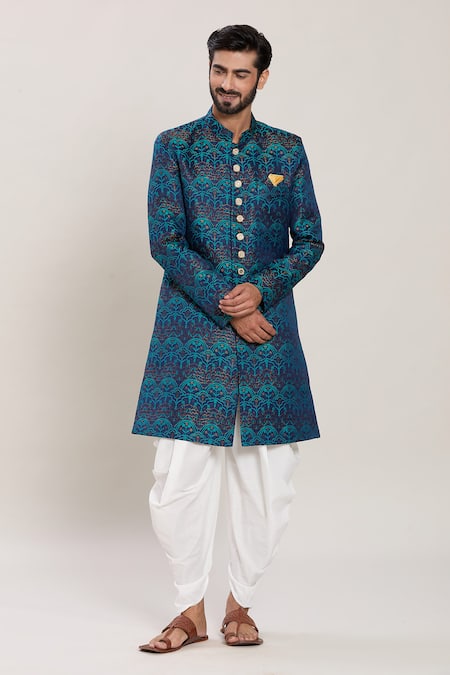 Blue kurta featuring floral scallop jacquard woven motifs. Paired with white peshawari pant with an elasticated waistband.
