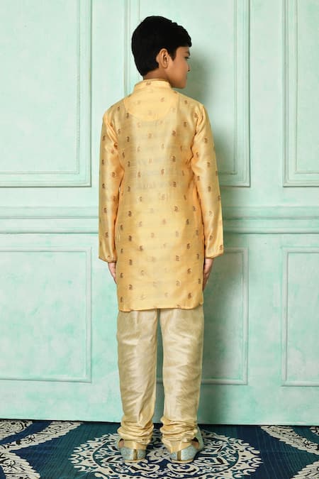 Light yellow kurta featuring woven paisley motifs and embellished buttons. Paired with a beige churidar for a complete look.