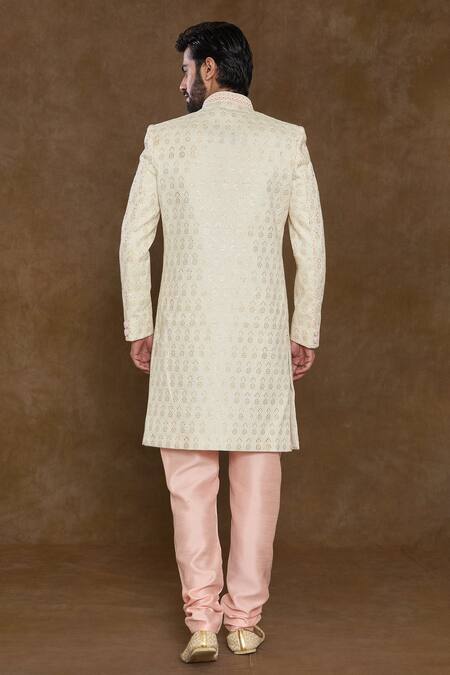 Peach sherwani featuring floral hand work with sequin and bead embellishments. Paired with a churidar and a dupatta with embellished hem.