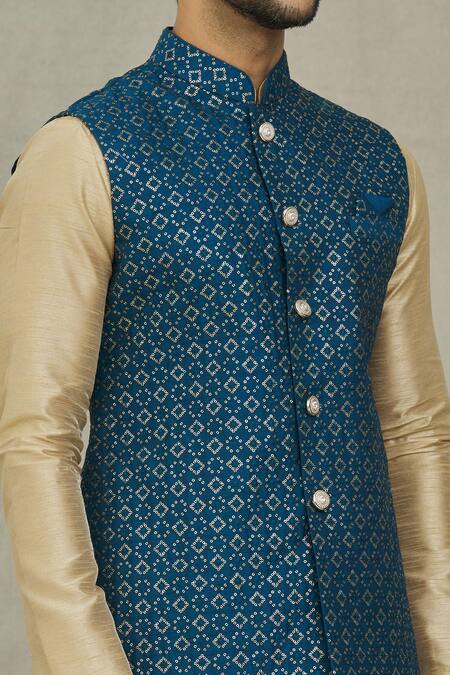 Blue sleeveless bundi featuring sequin and thread embroidery in diamond pattern with a mandarin collar. Paired with a gold full sleeve kurta and churidar.