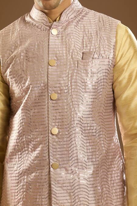 Pink sleeveless bundi featuring sequin and thread embroidery in scallop pattern with a mandarin collar. Paired with a gold full sleeve kurta and churidar.
