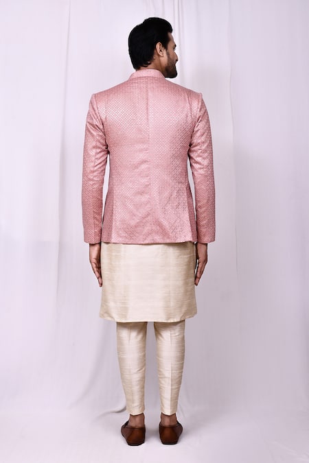 Pink front open jacket featuring all-over sequin embroidery. Paired with a cream kurta and pant pyjama.