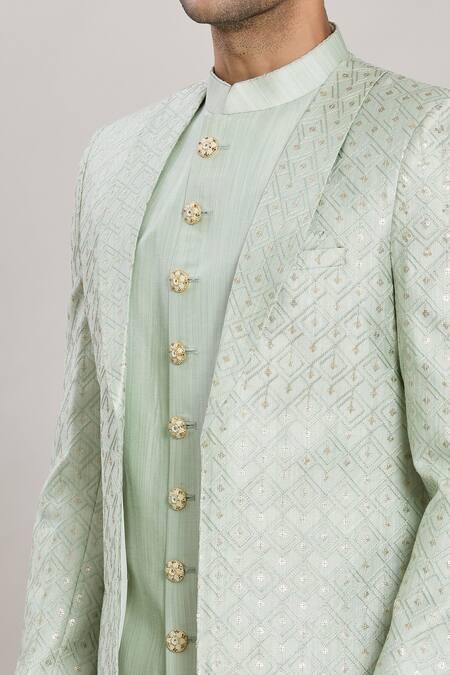 Pista green sherwani featuring geometric sequin embroidery and a shawl collar. Paired with a matching inner kurta and off white aligadhi pant.
