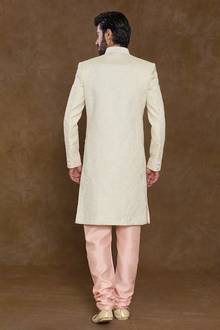 Peach sherwani featuring intricate sequin and bead hand embroidery. Paired with a churidar and a dupatta with an embroidered hem.
