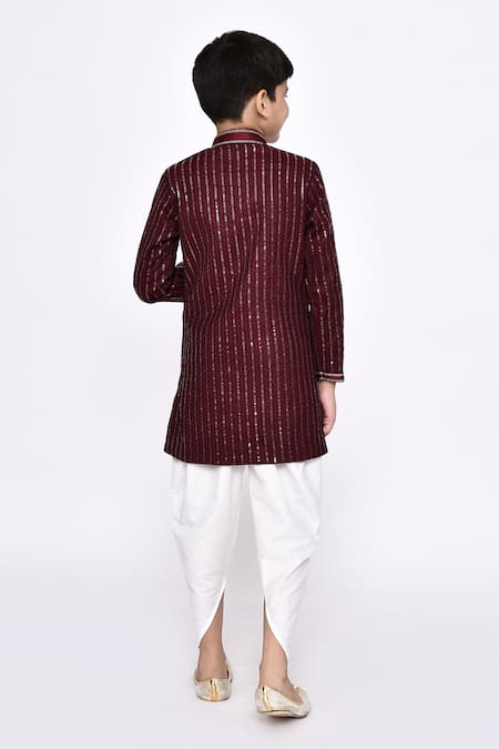 Dark maroon sherwani featuring sequin threadwork embellished striped patterns and a mandarin collar. Paired with a silk dupion dhoti pant for a complete traditional look.