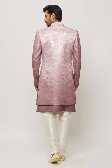 Buy_Arihant Rai Sinha_Pink Silk, Faux Leather Shaded Thread Work Sherwani Jacket Aligadi Pant Set