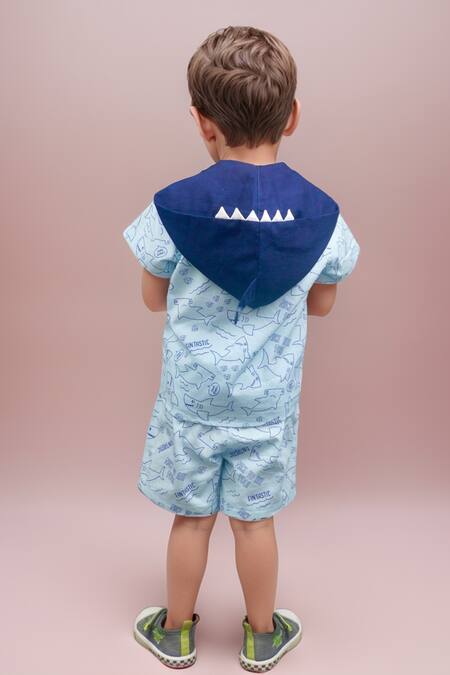 Blue cotton shirt featuring shark print and a hood. Paired with coordinating blue shorts with similar print.