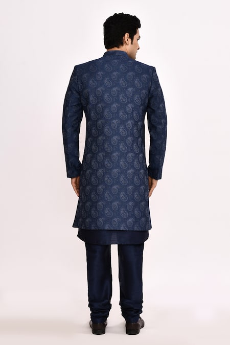 Blue silk blend sherwani featuring a traditional design with a mandarin collar