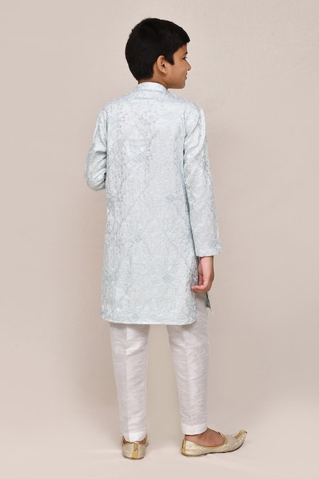 Sky blue kurta featuring intricate thread work and a mandarin collar. Paired with white art silk pants that offer a comfortable fit.