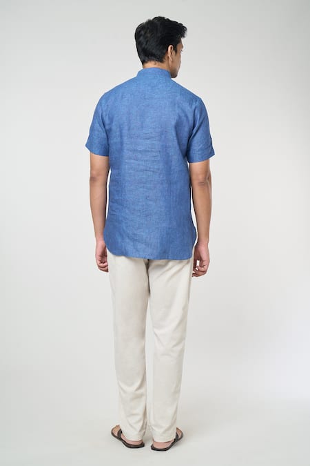 Blue kurta featuring a band collar and half sleeves, crafted in linen