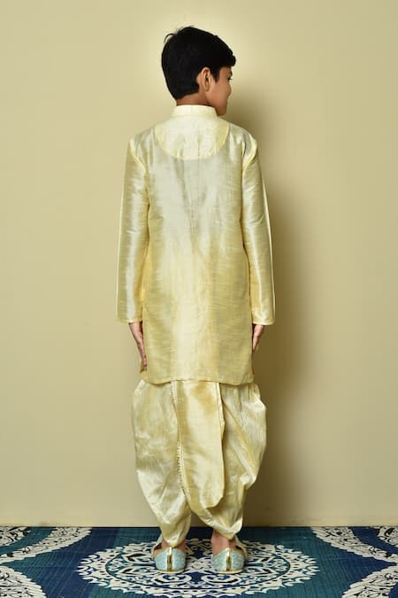 Beige kurta featuring a stand collar and full sleeves with a half button placket. Paired with pleated dhoti pants in a matching color.