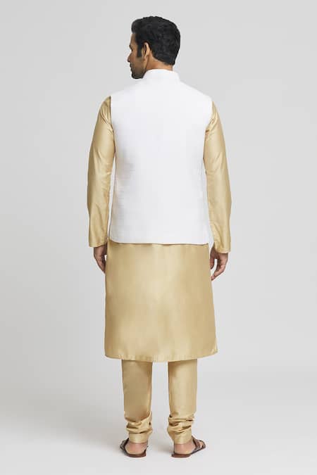 Off white bundi featuring a mandarin collar, welt pockets, and front button closures. Paired with a plain gold kurta and churidar made from art silk.