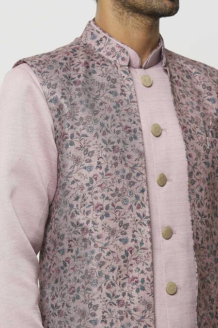 Pink solid sherwani featuring a band collar and long sleeves. Paired with a grey printed jacket and aligadi pant.