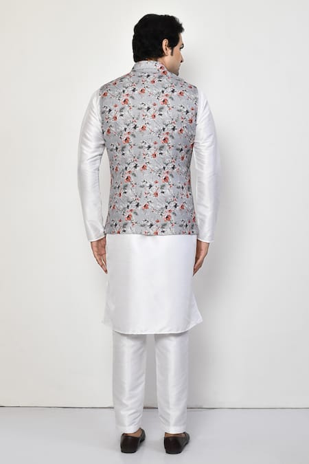 Grey sleeveless bundi featuring an all-over spring blossom art print. Paired with a white full-sleeve plain kurta and pant.