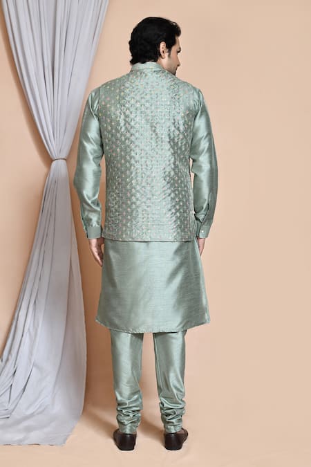 Green art silk bundi featuring all over star burst motif resham embroidery and sequin highlights. Paired with a solid kurta and silk churidar.