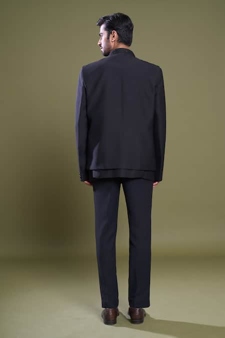 Black bandhgala featuring a band collar and full sleeves, paired with a matching jacket adorned with starry cutdana embroidery. Complemented with relaxed fit pants in a Japanese viscose blend.