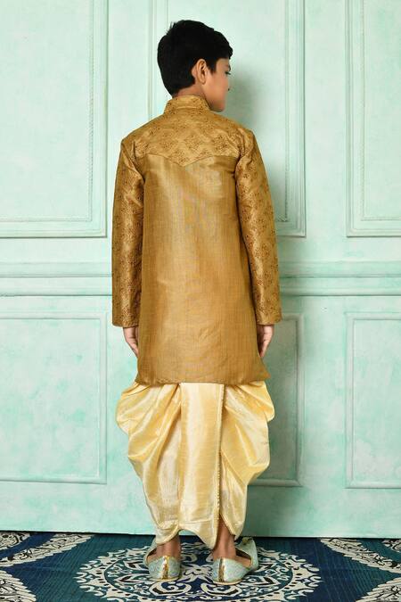 Yellow kurta in dupion art silk featuring floral embroidery and a mandarin collar. Paired with beige dhoti pant with side slits and front potli button detailing.