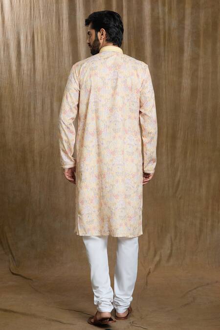Cream floral printed kurta featuring thread work and pintucks embroidered neckline and cuffs. Paired with a plain pyjama in art silk fabric.